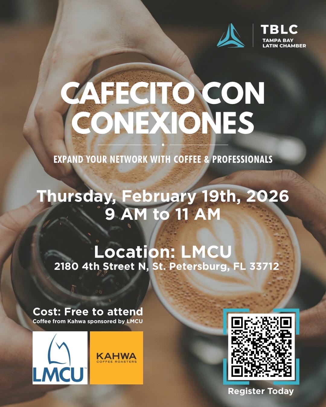 Join us for our monthly Cafecito con Conexiones from 9AM–11AM at a different local coffee shop or bakery around the Tampa Bay area.