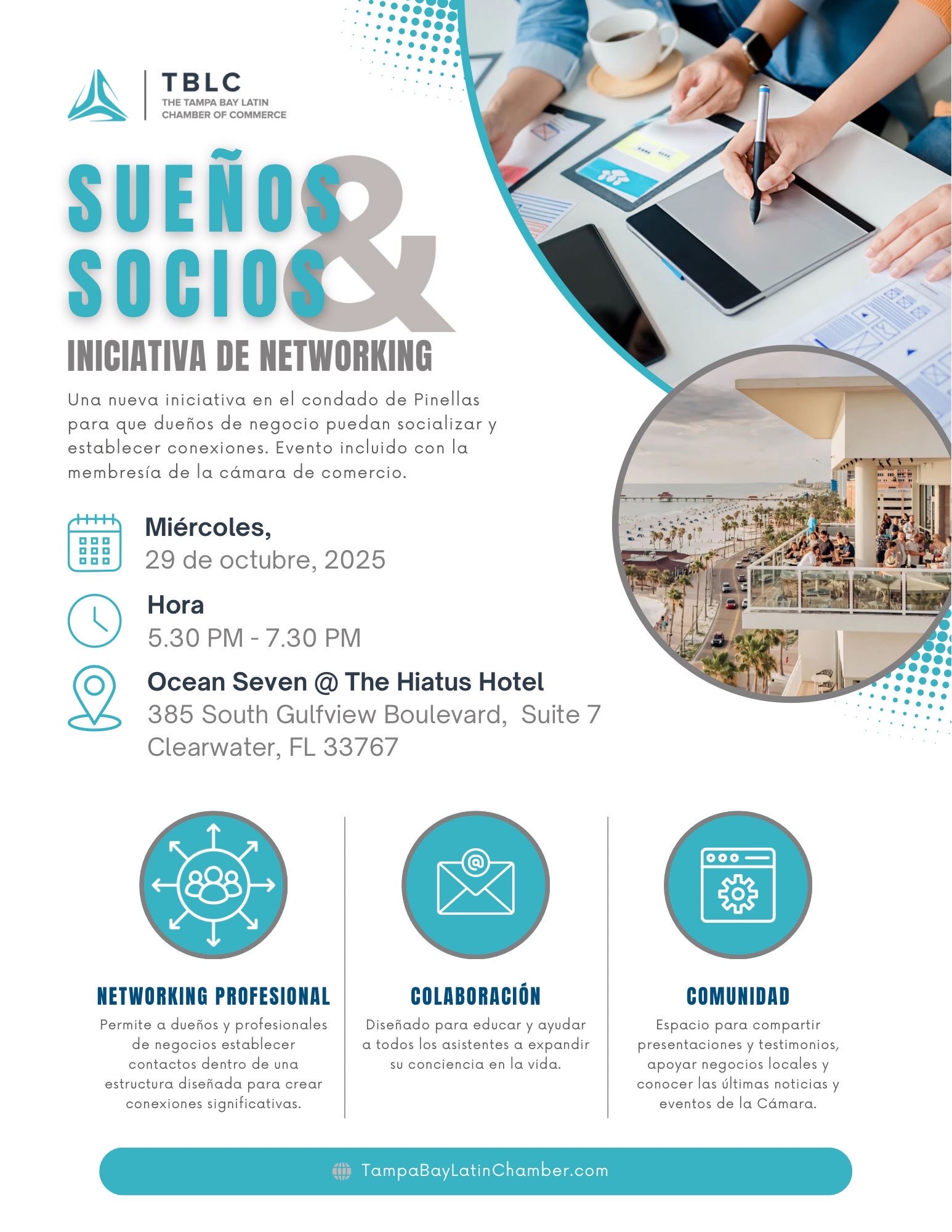 Step into a space where dreams and partnerships thrive! The Tampa Bay Latin Chamber’s Socios y Sueños is Pinellas County’s newest business networking experience – designed to connect entrepreneurs, professionals, and community leaders in a dynamic, welcoming atmosphere.