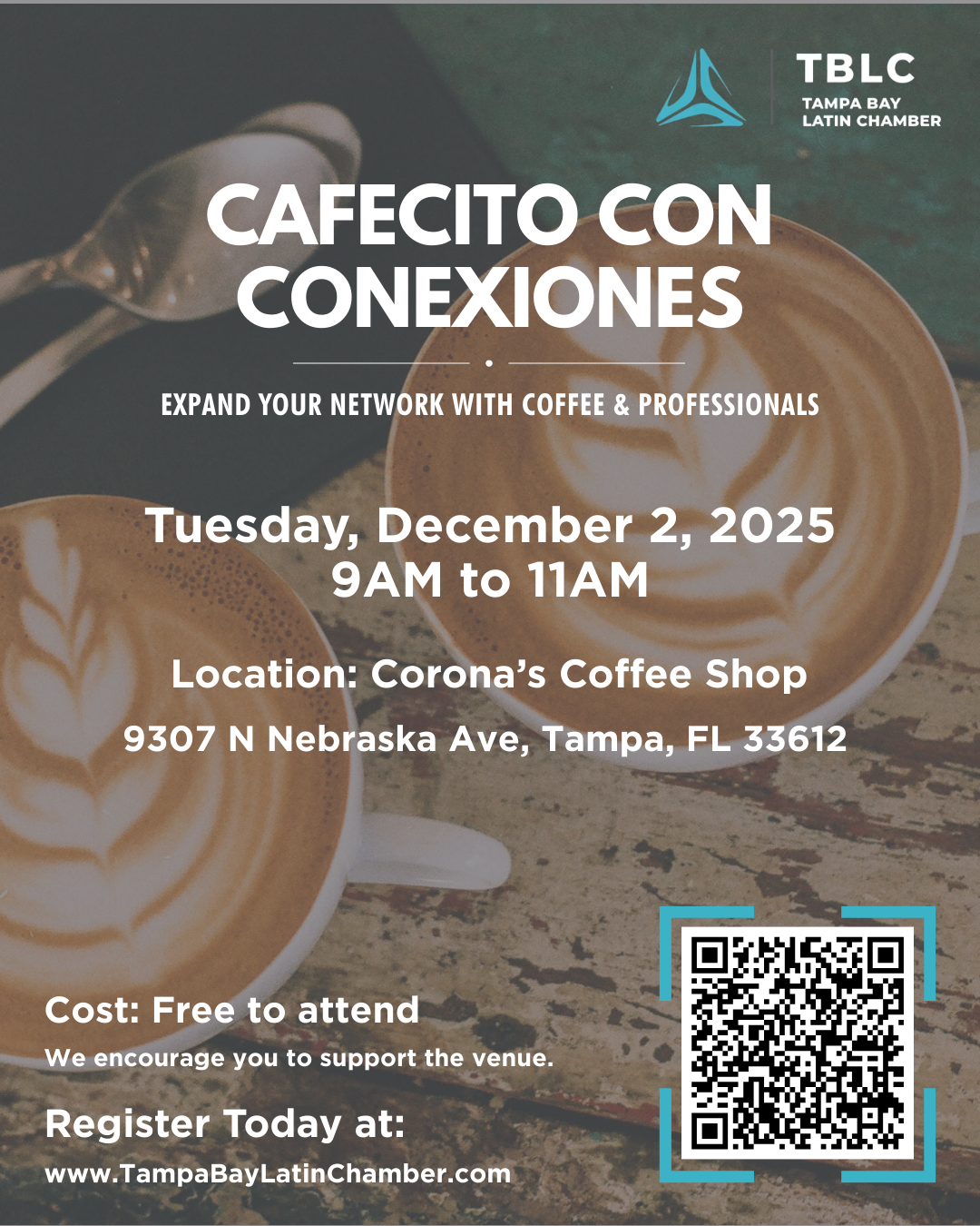 Join us for our monthly Cafecito con Conexiones from 9AM–11AM at a different local coffee shop or bakery around the Tampa Bay area.